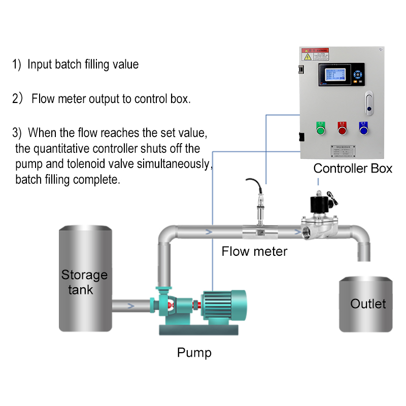 The batch filling control system consists of a quantitative control box, flow meter, solenoid valve, and water pump, offering three quantitative control modes: controlling the water pump, the solenoid valve, and both the water pump and solenoid valve simultaneously. It is suitable for applications such as quantitative water addition, material dispensing, and filling. The button-operated control box allows for one-button start, stop, and reset, ensuring convenient operation. It supports RS485/4-20mA signal input, allows for querying cumulative reports, and can be customized with an explosion-proof model, efficiently meeting various quantitative requirements.