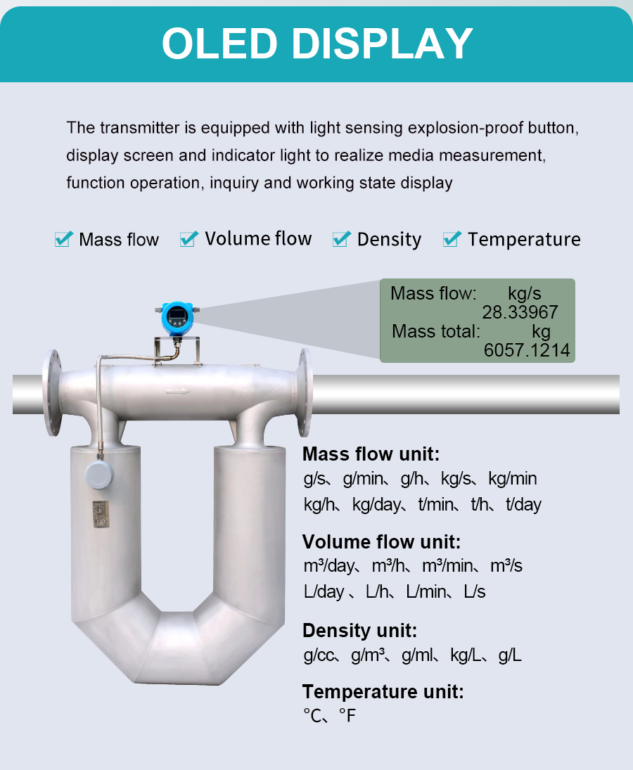 This Coriolis flow meter is suitable for DN25-100 pipelines and is compatible with liquid, gas, and slurry media. The integrated version has a temperature range of -40~125℃, while the remote version reaches -40~204℃. It is equipped with a triangular/U-shaped sensor and a DSP transmitter, and is explosion-proof certified. It supports DC24V/AC220V power supply, and outputs RS485, 4-20mA, and pulse signals, with an accuracy of 0.15%/0.2%. Pressure options include 1.6-6.3MPa (high pressure 10-26MPa customizable), and hygienic and process connections are also customizable, making it suitable for various industrial measurement applications.