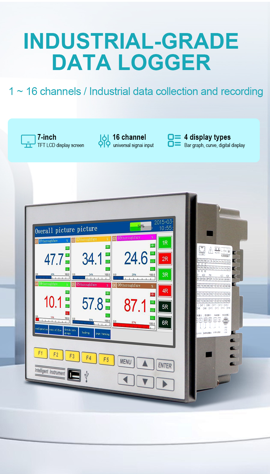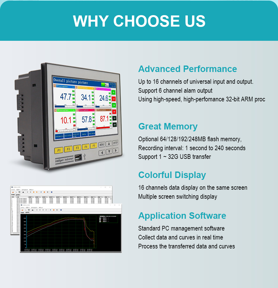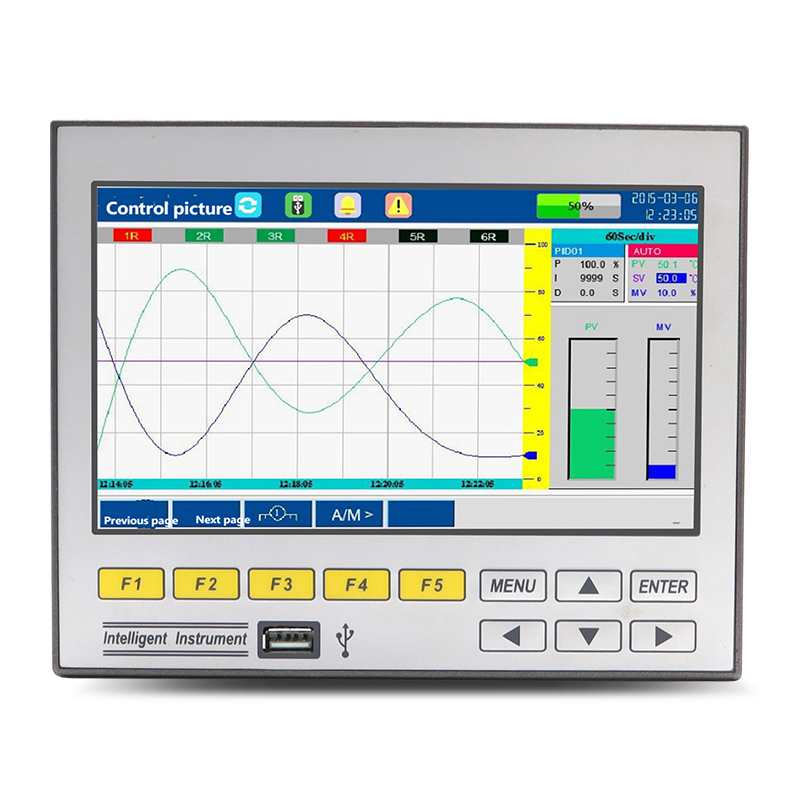 The GT71R data logger features a highly integrated color touchscreen design. It supports 1-16 analog inputs, 1-4 4-20mA outputs, and 1-6 relay outputs, along with 1-6 24VDC power outputs for sensor power supply. It is equipped with RS232C/RS485 communication interfaces, with the RS232C port allowing direct connection to a miniature printer. It also features power failure and clock protection. Suitable for petrochemical, food processing, environmental protection, medical, and other industries, it is an ideal choice for process monitoring and data recording, helping to improve the efficiency of intelligent manufacturing and energy management.