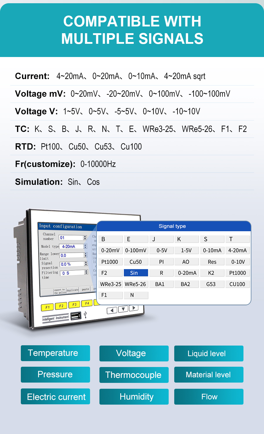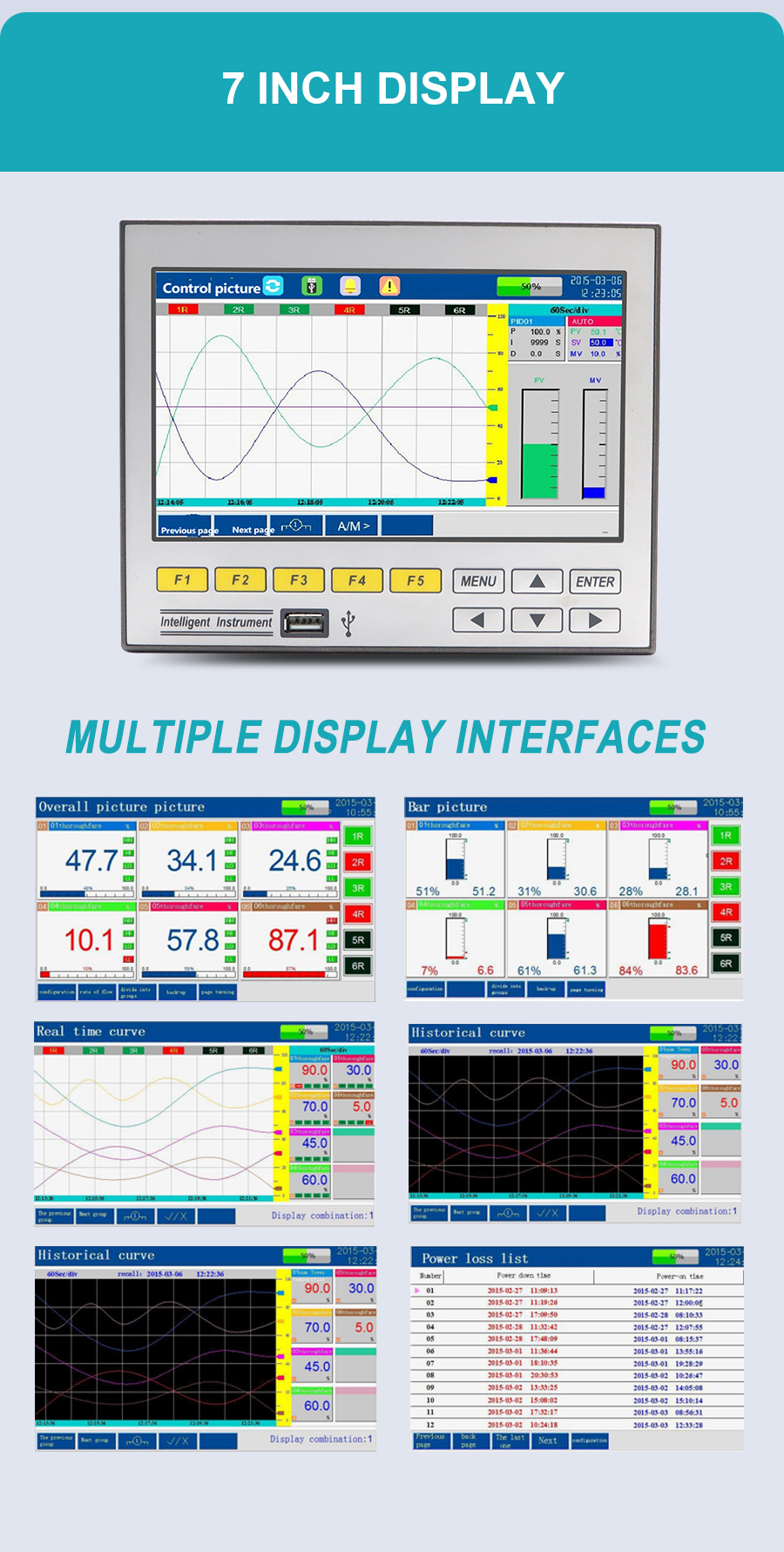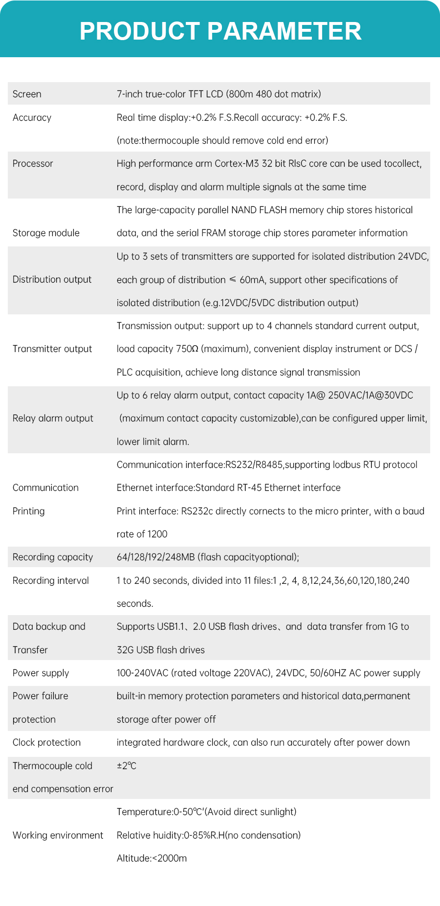 The GT71R data logger features a highly integrated color touchscreen design. It supports 1-16 analog inputs, 1-4 4-20mA outputs, and 1-6 relay outputs, along with 1-6 24VDC power outputs for sensor power supply. It is equipped with RS232C/RS485 communication interfaces, with the RS232C port allowing direct connection to a miniature printer. It also features power failure and clock protection. Suitable for petrochemical, food processing, environmental protection, medical, and other industries, it is an ideal choice for process monitoring and data recording, helping to improve the efficiency of intelligent manufacturing and energy management.