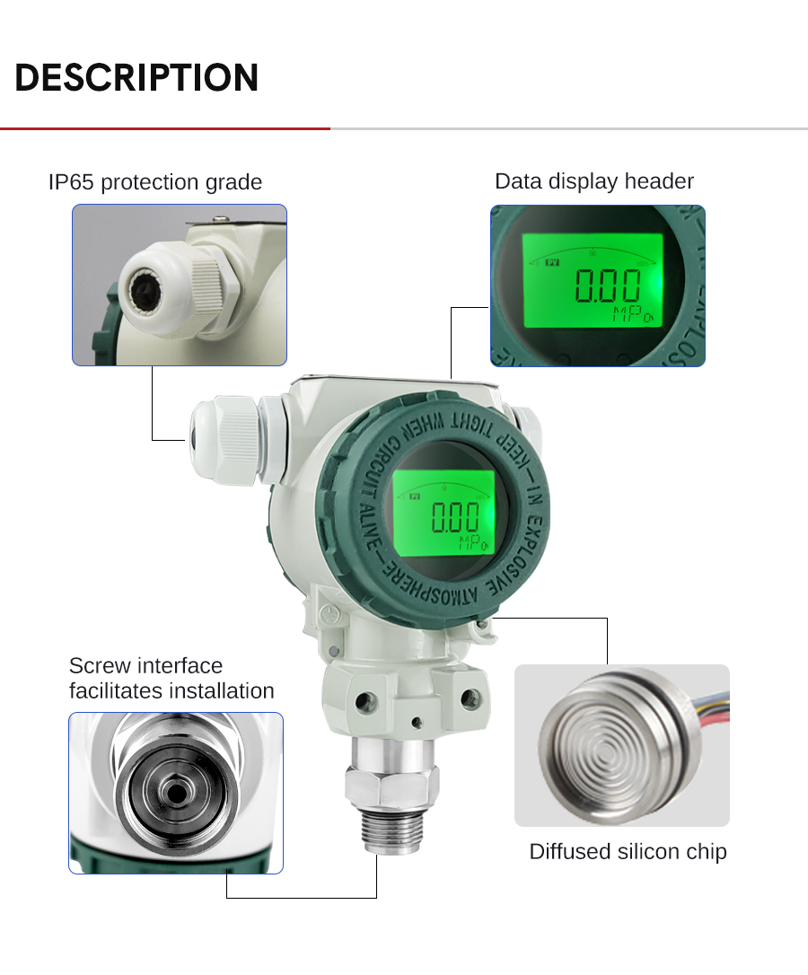 The pressure sensitive core of the pressure transmitter uses a high-performance silicon piezoresistive pressure oil-filled core. The internal dedicated integrated circuit converts the sensor millivolt signal into a standard voltage, current or frequency signal, which can be directly interfaced with a computer for control. Instruments, smart instruments or PLC can be easily connected. Long-distance transmission can use current output mode.