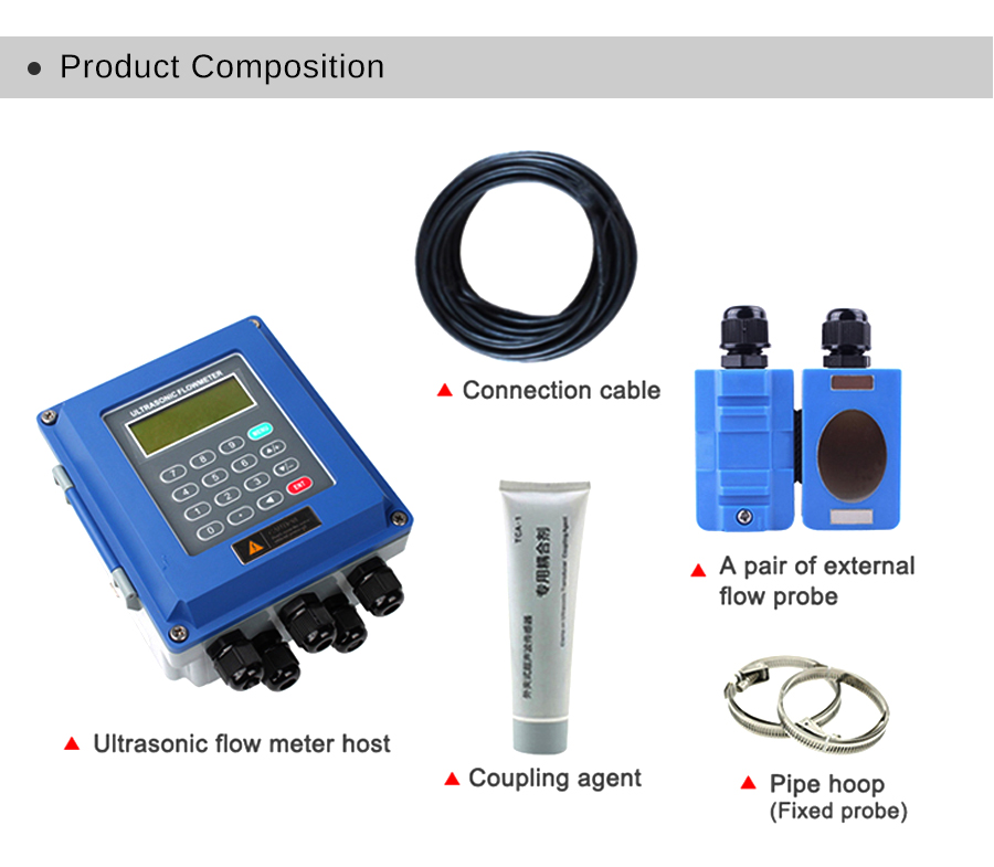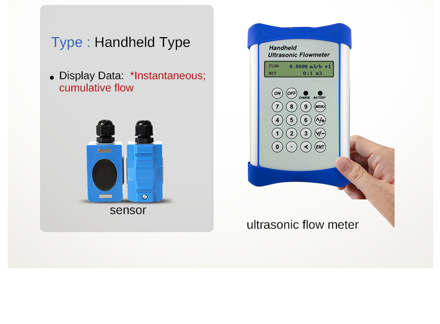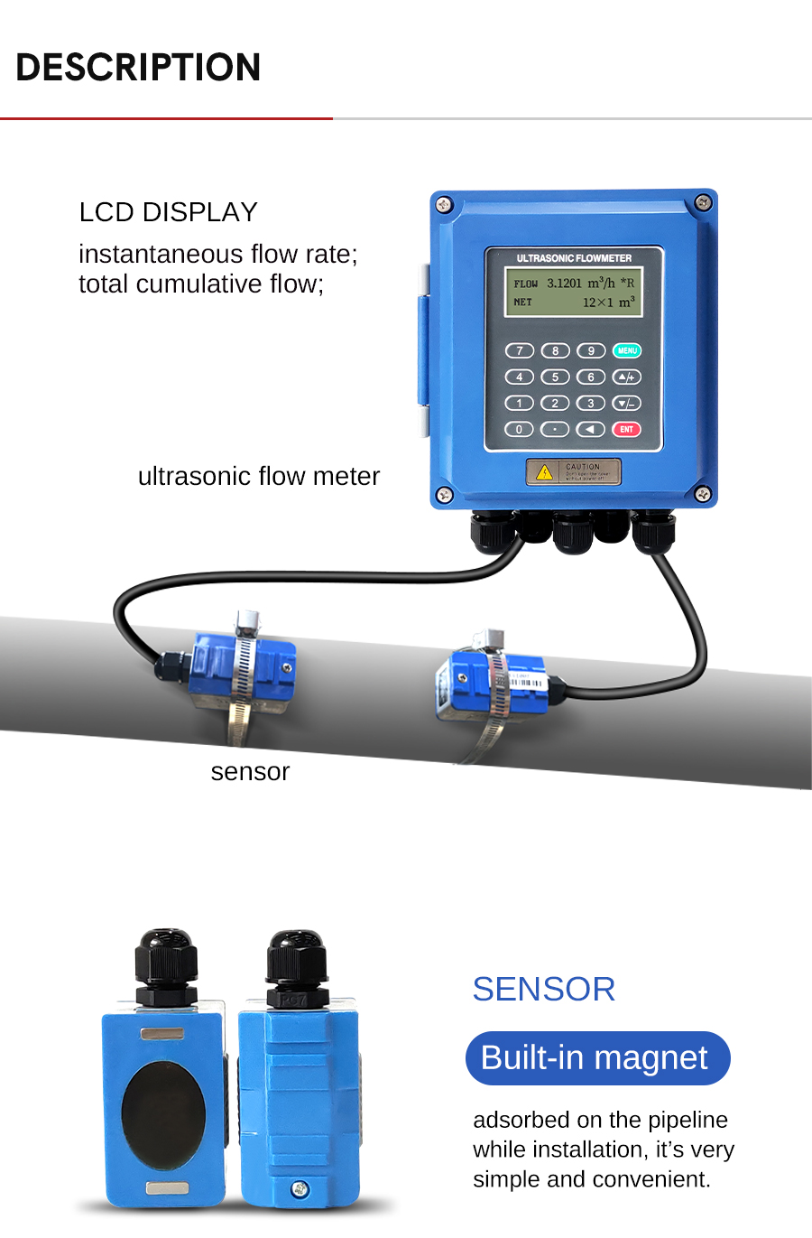 Ultrasonic flowmeter is suitable for flow measurement in pipelines of various sizes. The measurement medium is a single stable liquid such as water, seawater, sewage, alcohol, etc. The measurement material is uniform and dense pipes such as steel, stainless steel, cast iron, PVC, fiberglass, etc. Characteristics ● Can measure single stable liquids such as water and sea water ● Non-contact flow meter ● Suitable for pipes DN32-DN6000 ● 16-button or 4-button window operation