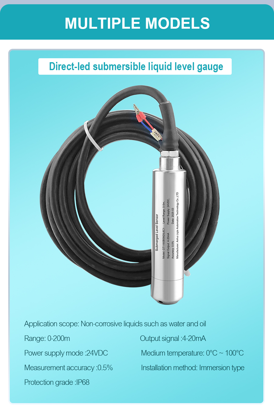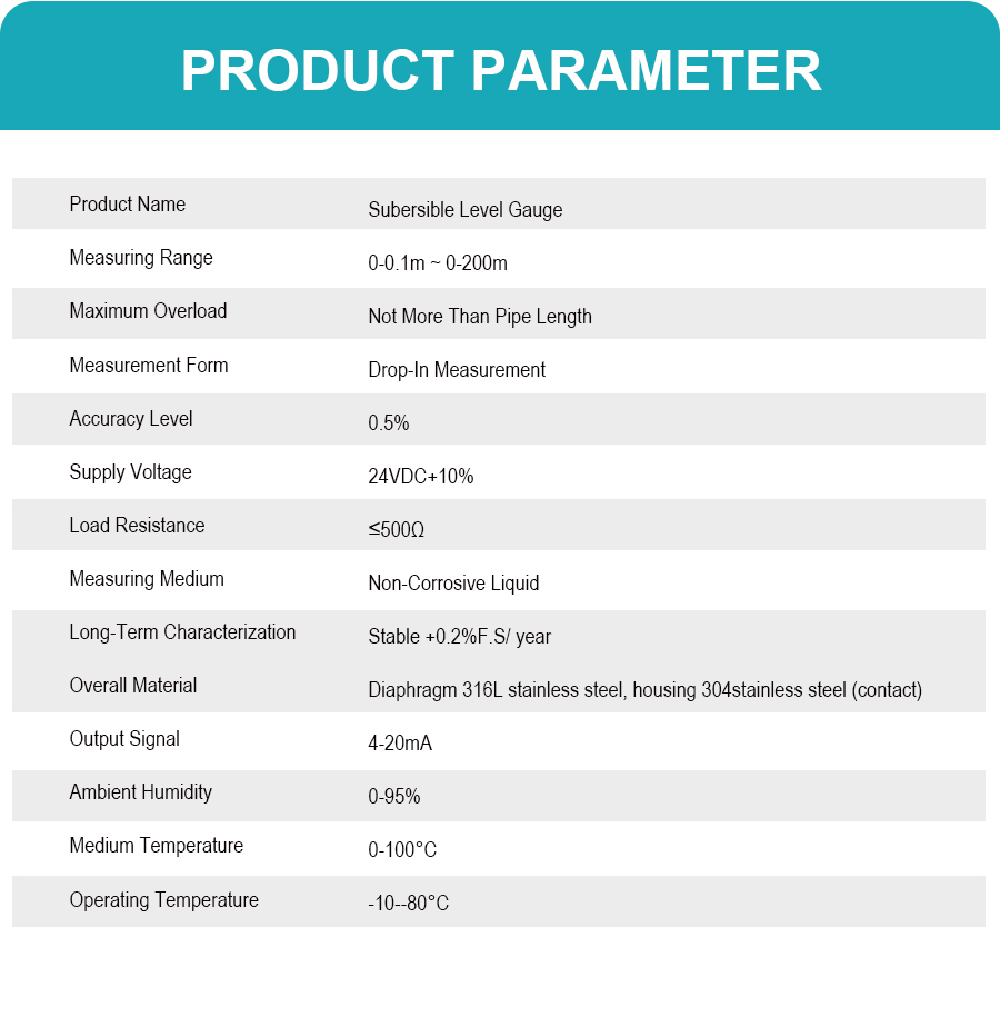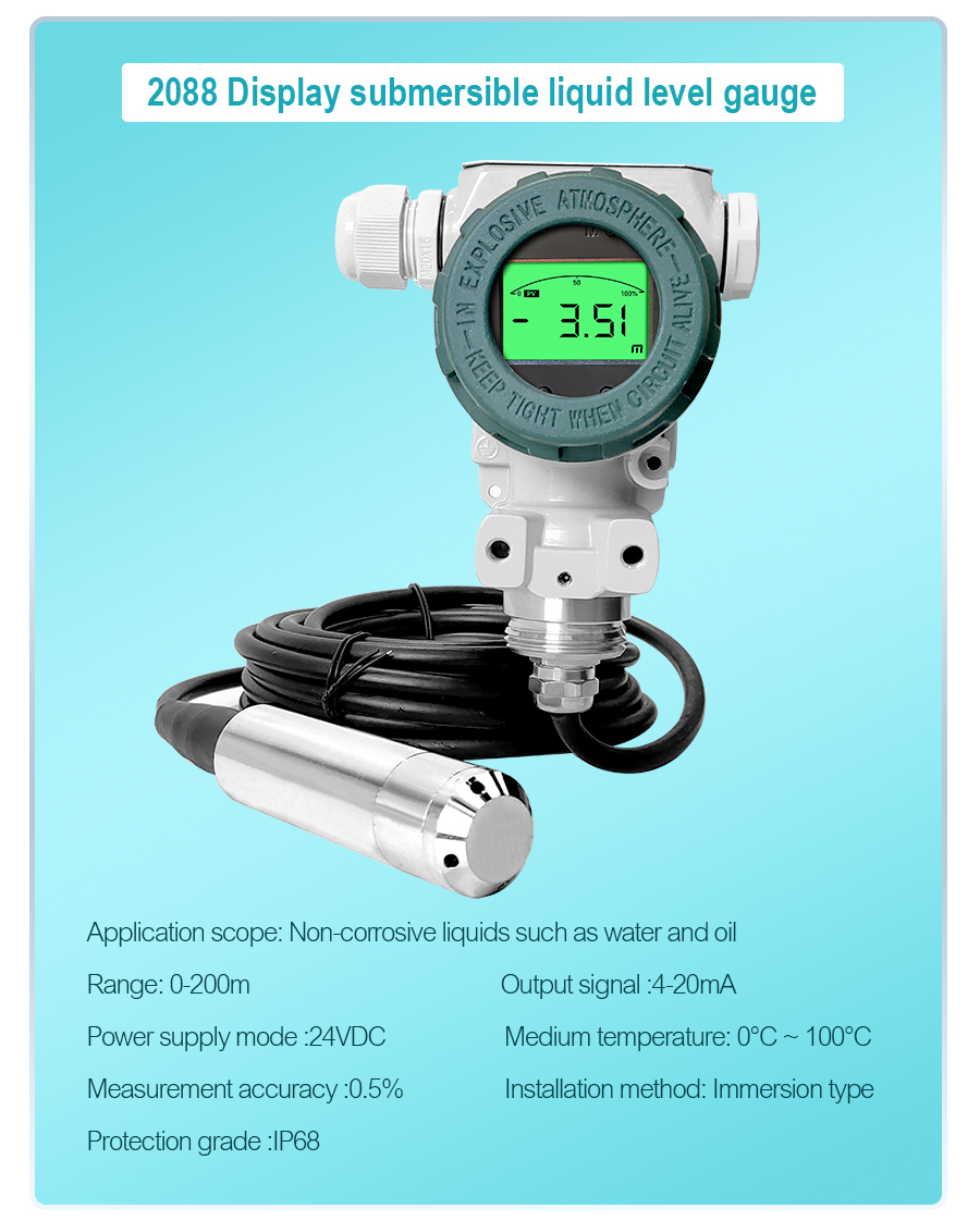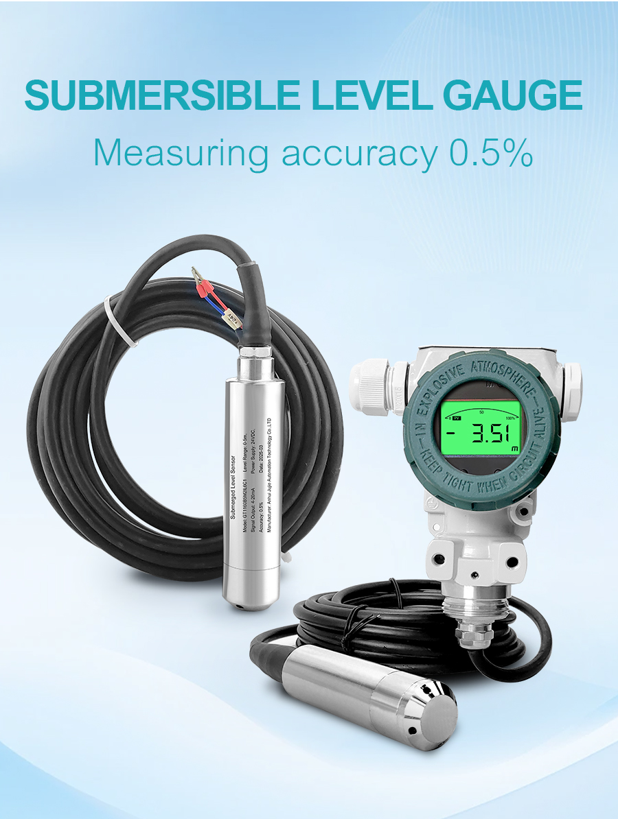 Submersible level transmitters are high-precision, high-stability instruments for liquid level measurement. Utilizing advanced pressure sensing technology, they measure liquid level depth in real time by detecting hydrostatic pressure. They are suitable for applications in urban sewage systems, petrochemical industries, reservoirs, and dams. Featuring a compact size and easy installation, they offer a maximum measurement depth of 200 meters, support 4-20mA signal output and temperature compensation, and possess excellent corrosion resistance, anti-interference capabilities, and reverse polarity and overvoltage protection functions, making them practical and reliable.