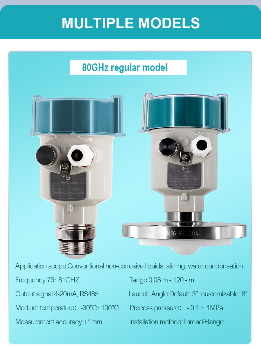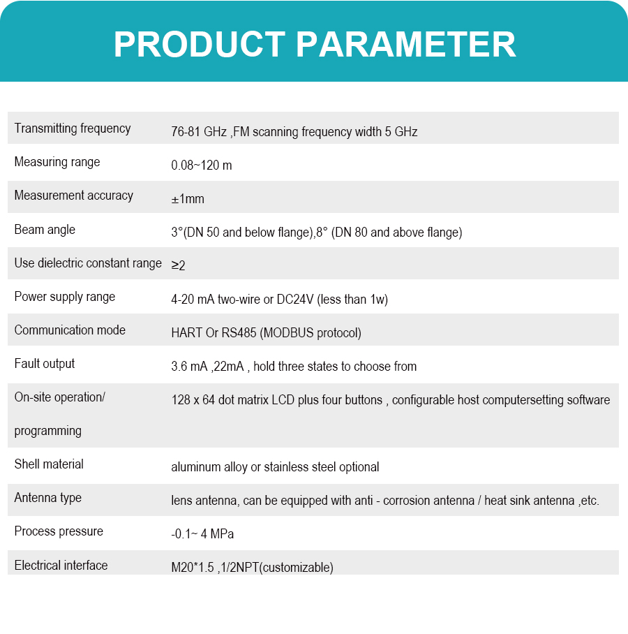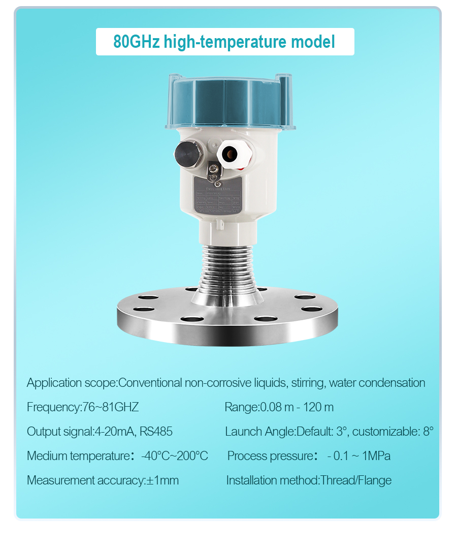The GTRD series radar level meter is a radar product that utilizes the Frequency Modulated Continuous Wave (FMCW) principle, suitable for liquid level and powder level monitoring in applications such as sewage tanks and reservoirs. This product boasts an accuracy of up to ±1mm, a maximum measurement range of 120m, and a minimum blind zone of 0.2m. It supports 4-20mA two-wire and RS485 communication. It can be used in conjunction with display instruments to achieve functions such as tank bottom display, level alarm, and control.