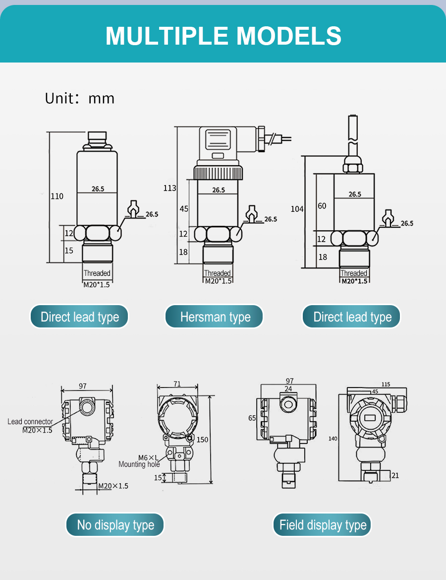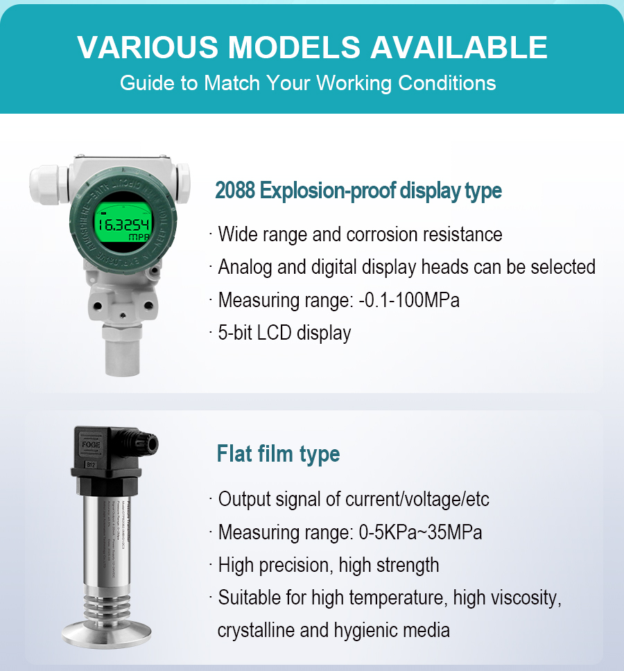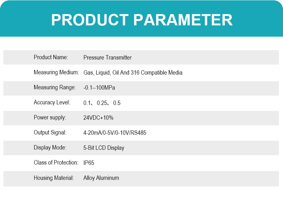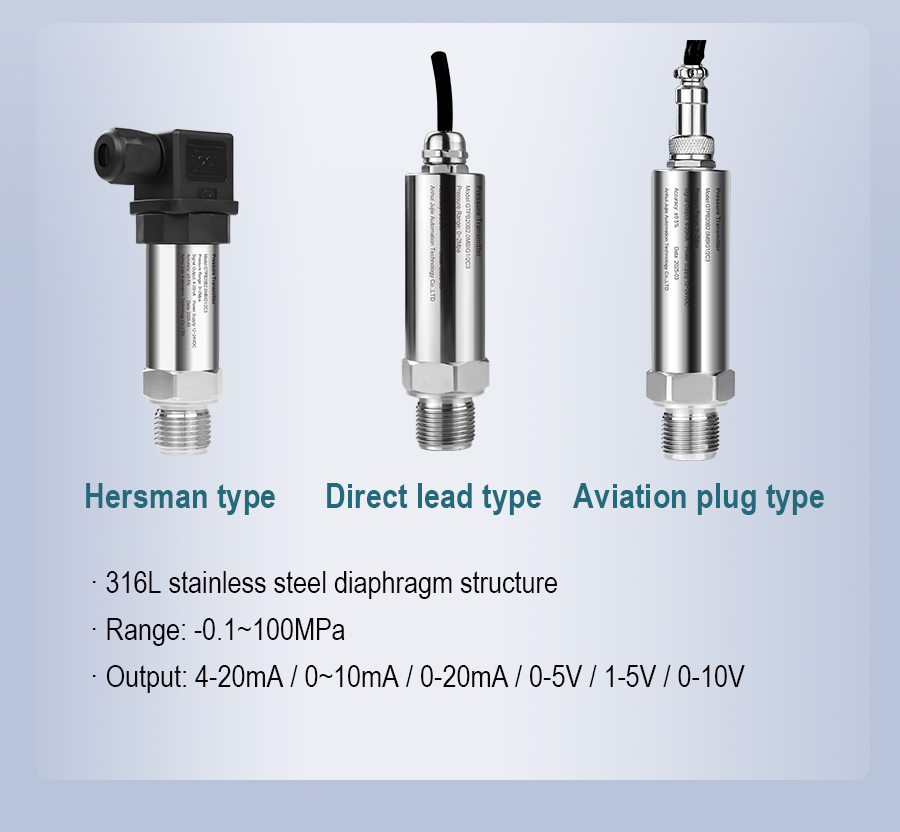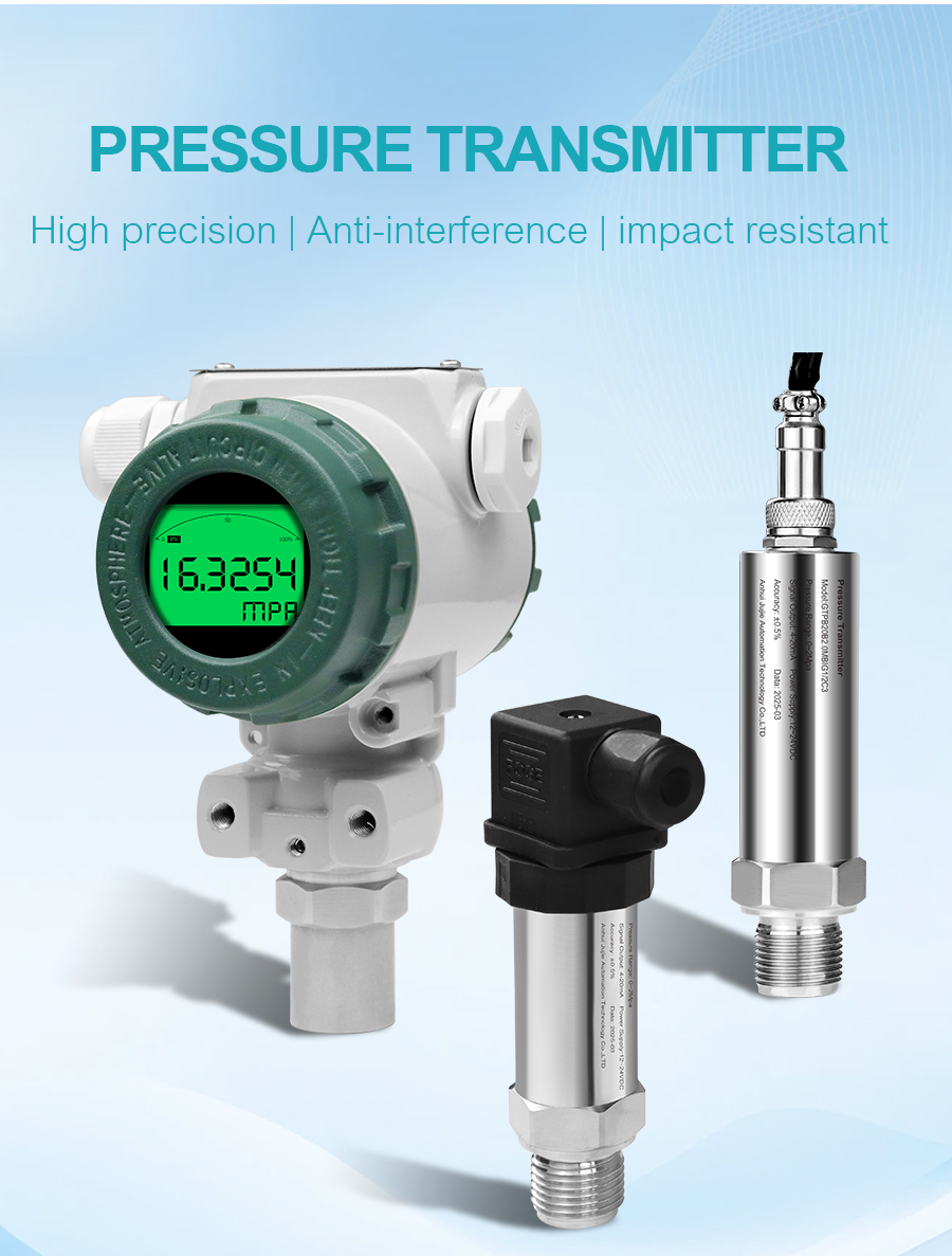 Pressure transmitters are high-precision industrial automation instruments that monitor and control changes in liquid, gas, and steam pressure in real time. They feature a compact design for easy installation, a corrosion-resistant stainless steel housing, and a wide measurement range of -0.1 to 100 MPa. They support various output signals, including 4-20mA. Models with displays support HART communication, offering communication and self-diagnostic functions. They can measure gauge pressure, negative pressure, and absolute pressure, and are widely used in industrial fields such as water treatment plants, wastewater treatment plants, and machinery manufacturing plants.